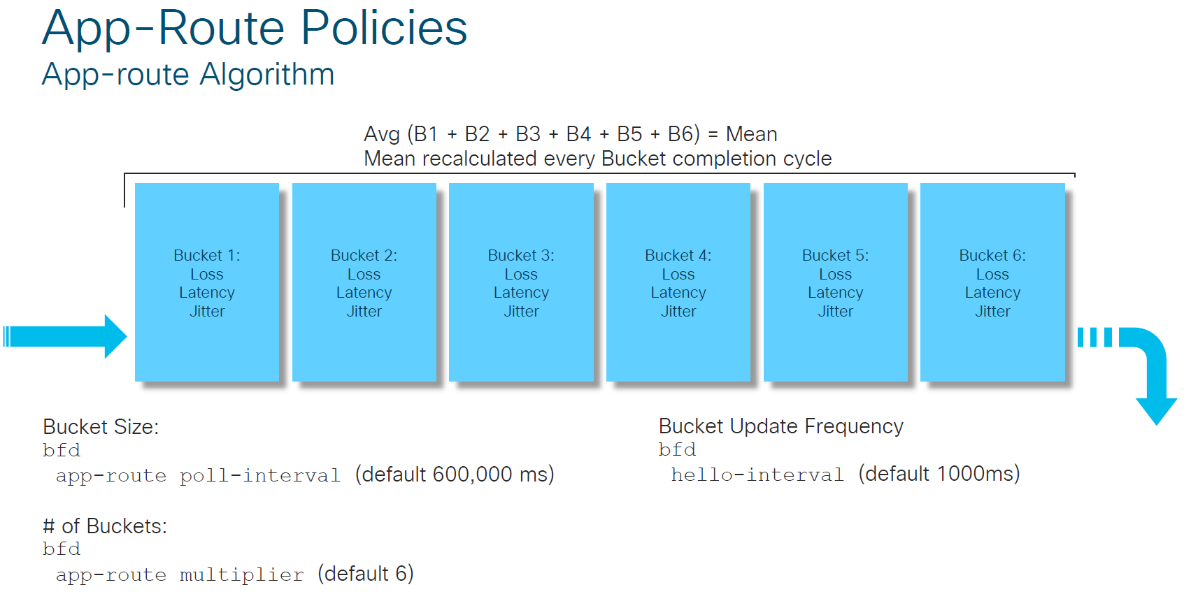 The AAR policy relies on the BFD probes sent through the IPsec tunnels between Edge appliances. The results of the probes are stored in buckets, and each bucket has a specific duration/length. A mean average calculation of all the buckets is the result observed by the solution when reporting link quality. The group of thresholds to be met (and to which the quality of the links are compared) is called SLA.