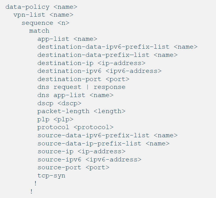 Analogous to route-maps in Cisco IOS, the data policy contains a set of elements that can be matched, and a set of actions which can be performed upon matching them.