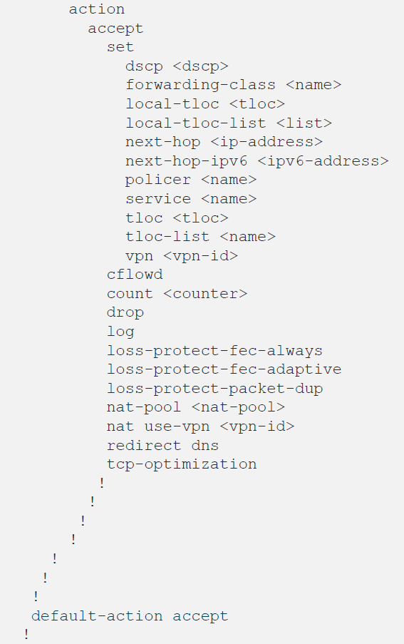 Note the capability to rewrite DSCP values and forwarding classes (QoS queues), redirect traffic to a specific next hop (outside of the overlay), TLOC or set of TLOCs (both inside the overlay), use a NAT pool, or apply a policer.
